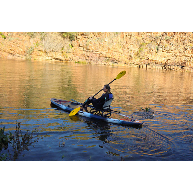 Amberjack combines the best features of a SUP and a kayak with Vanhunks' renowned technology. It measures 34 inches wide and can be paddled with a kayak or SUP paddle. Secure your gear using the bungee storage areas equipped with premium quality fixtures.
